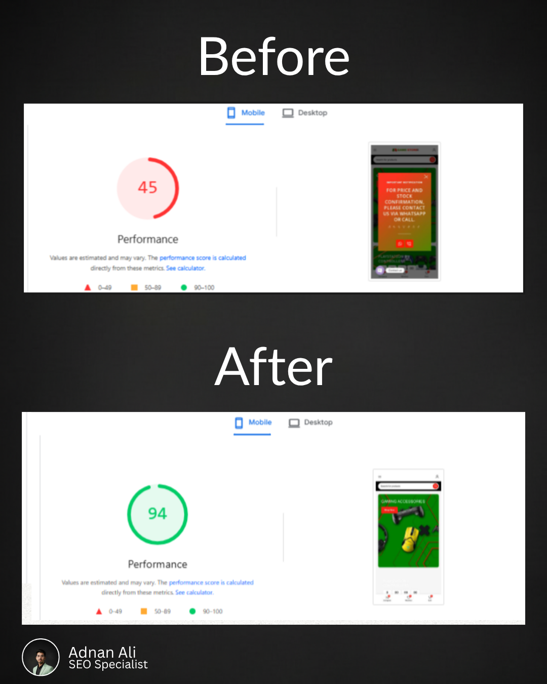 I improved the website’s Mobile Performance Score from 45 to 95, fixing core issues related to speed, responsiveness, and loading experience.